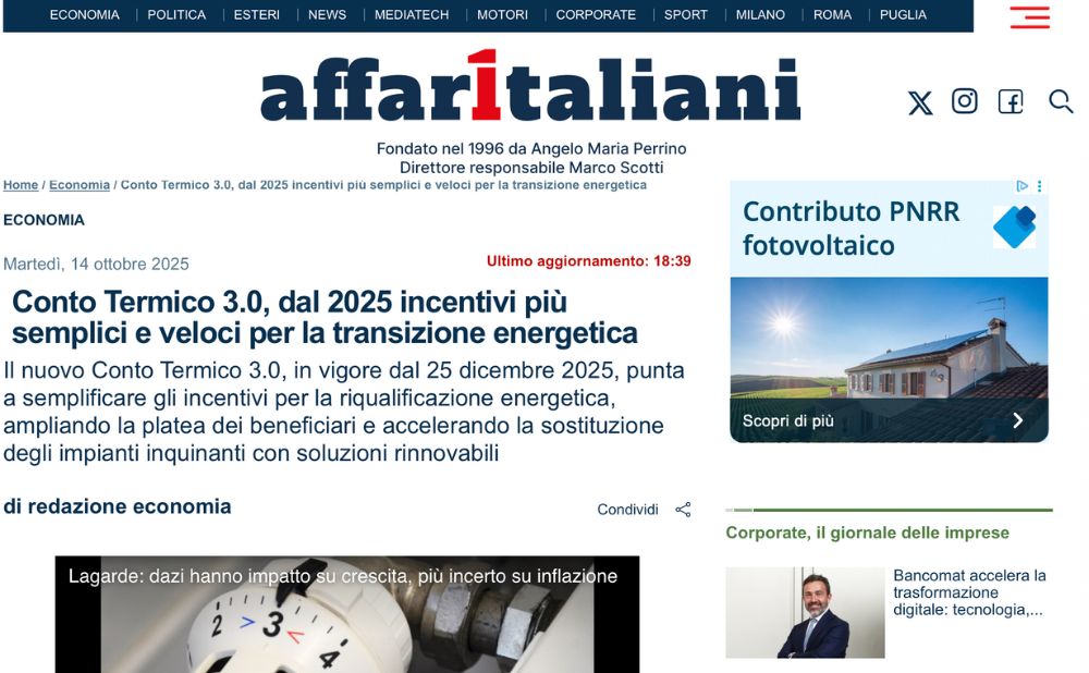 Un articolo di Affaritaliani.it del 14 ottobre approfondisce i dettagli del nuovo Conto Termico 3.0, che entrerà in vigore dal 25 dicembre 2025 e che punta a semplificare gli incentivi per la riqualificazione energetica, ampliando la platea dei beneficiari e accelerando la sostituzione degli impianti inquinanti con soluzioni rinnovabili.